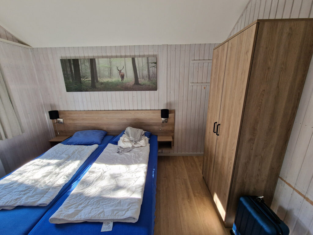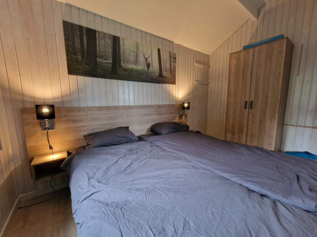 De grote slaapkamer is bereikbaar vanuit de woonkamer en voorzien van twee boxsprings (begin 2022), een garderobekast en nachtkastjes met leeslampjes en USB-aansluitingen.