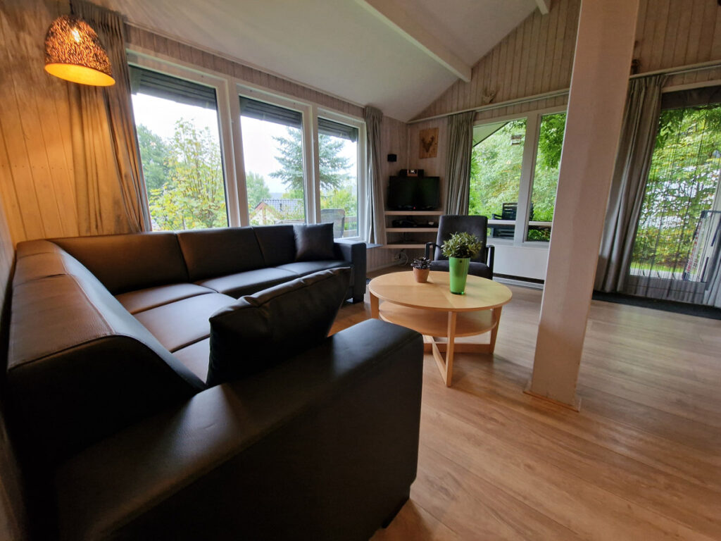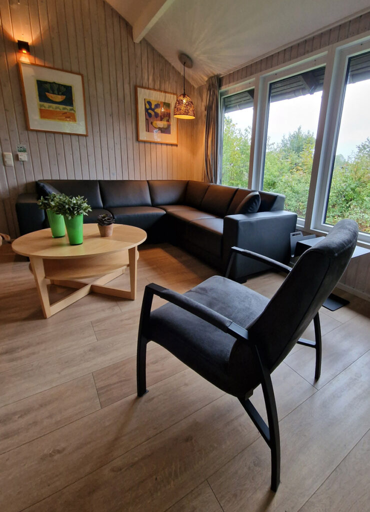 Het huisje heeft een lichte woonkamer met een grote hoekbank en een fauteuil (september 2022).